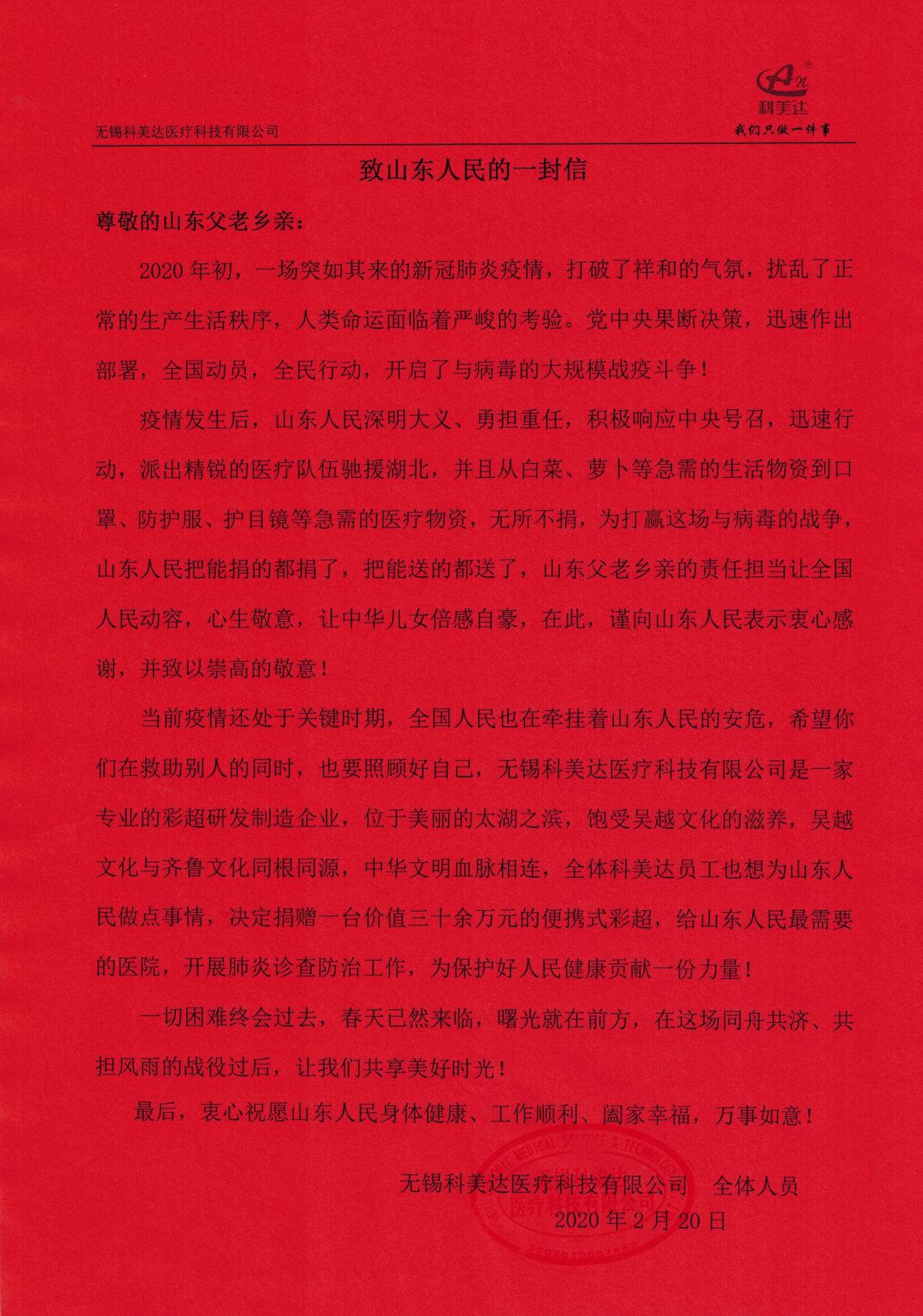 庚子年初,新冠肺炎疫情洶涌而來,隨著鐘南山院士馳援武漢指出新冠肺炎存在“人傳人”的現(xiàn)象,一場(chǎng)史無前例的疫情攻堅(jiān)戰(zhàn)在全國(guó)打響。武漢告急,全國(guó)馳援,從生活物資到醫(yī)療用品源源不斷往最需要的地方,山東人民搬家式的支援抗疫模式更是感動(dòng)了全國(guó)人民,彩超作為新冠肺炎病情診斷的重要手段,得到臨床專家的重視,為緩解疫情防控期間醫(yī)療物資緊缺狀況,有效防范醫(yī)護(hù)人員感染和疫情擴(kuò)散風(fēng)險(xiǎn),科美達(dá)公司主動(dòng)聯(lián)系山東省慈善機(jī)構(gòu),向濟(jì)南市鋼城區(qū)慈善總會(huì)定向捐贈(zèng)了價(jià)值38萬元的便攜式彩超設(shè)備,用于濟(jì)南市鋼城區(qū)醫(yī)院抗擊肺炎疫情和人民健康檢查,確保戰(zhàn)略后方穩(wěn)固。